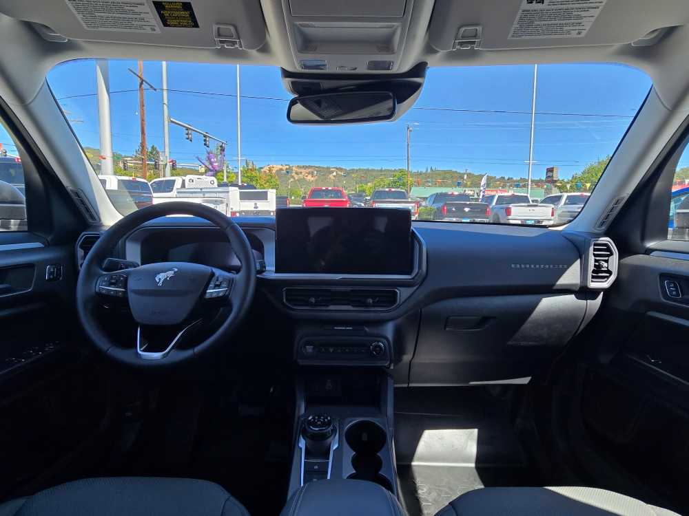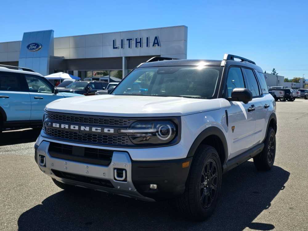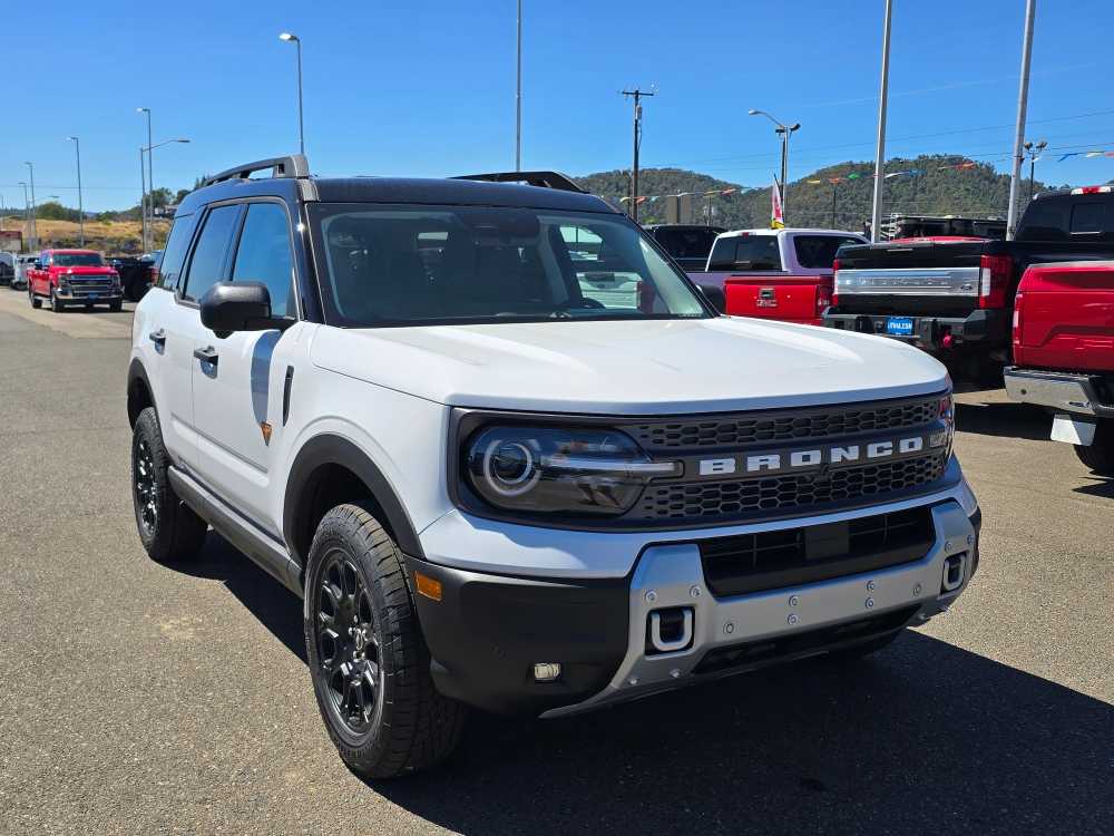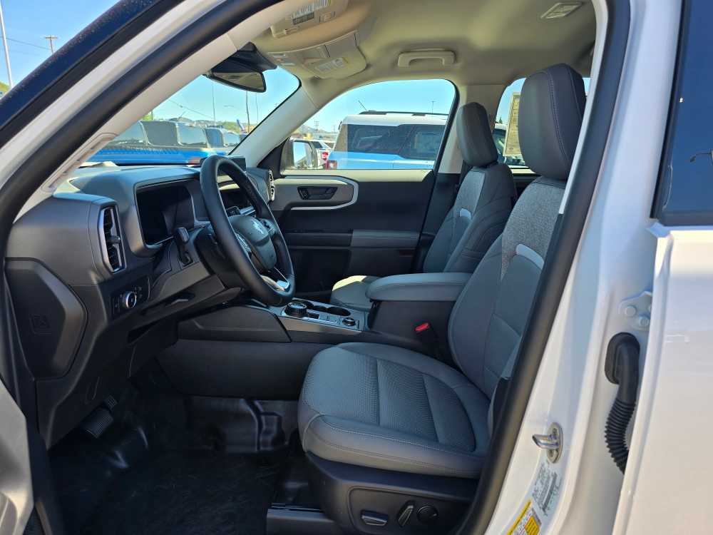 Leather Seats, 4x4, Heated Driver Seat, Back-Up Camera, Turbocharged, Satellite Radio, iPod/MP3 Input, Onboard Communications System, Trailer Hitch, Aluminum Wheels, Remote Engine Start, Lane Keeping Assist, Cross-Traffic Alert, Blind Spot Monitor, Smart Device Integration MP3 Player, Keyless Entry, Privacy Glass, Child Safety Locks, Steering Wheel Controls. 2025 Ford Bronco Sport with Oxford White exterior and Dark Space Gray interior features a 4 Cylinder Engine with 250 HP at 5500 RPM*. Non-Smoker vehicle