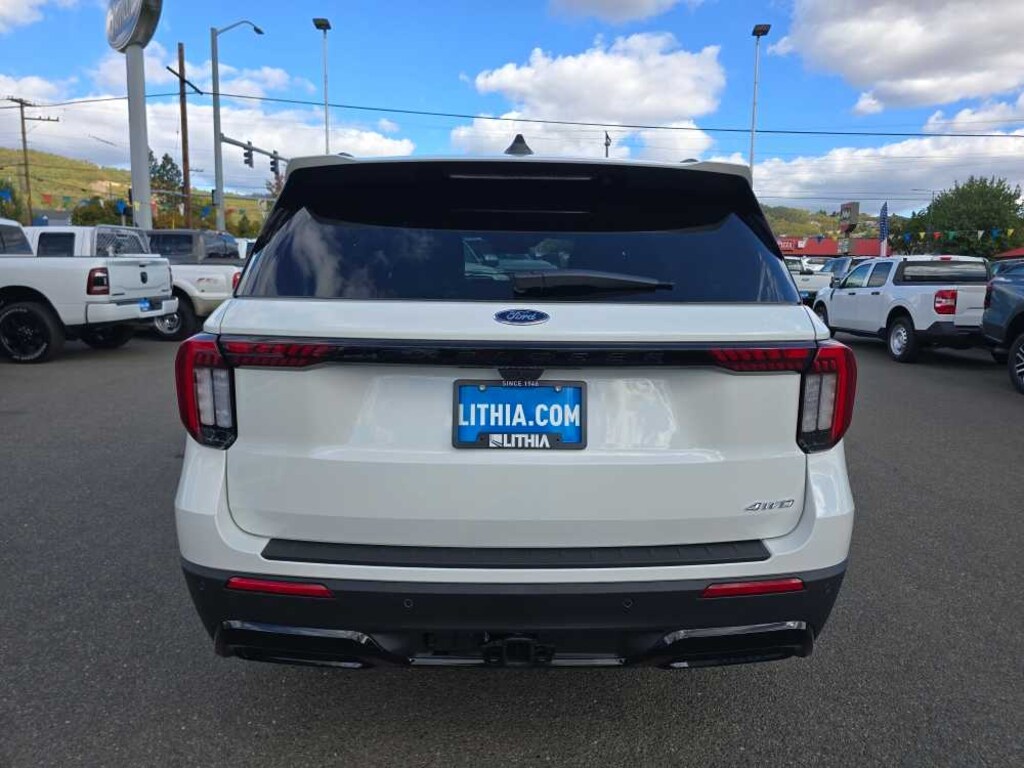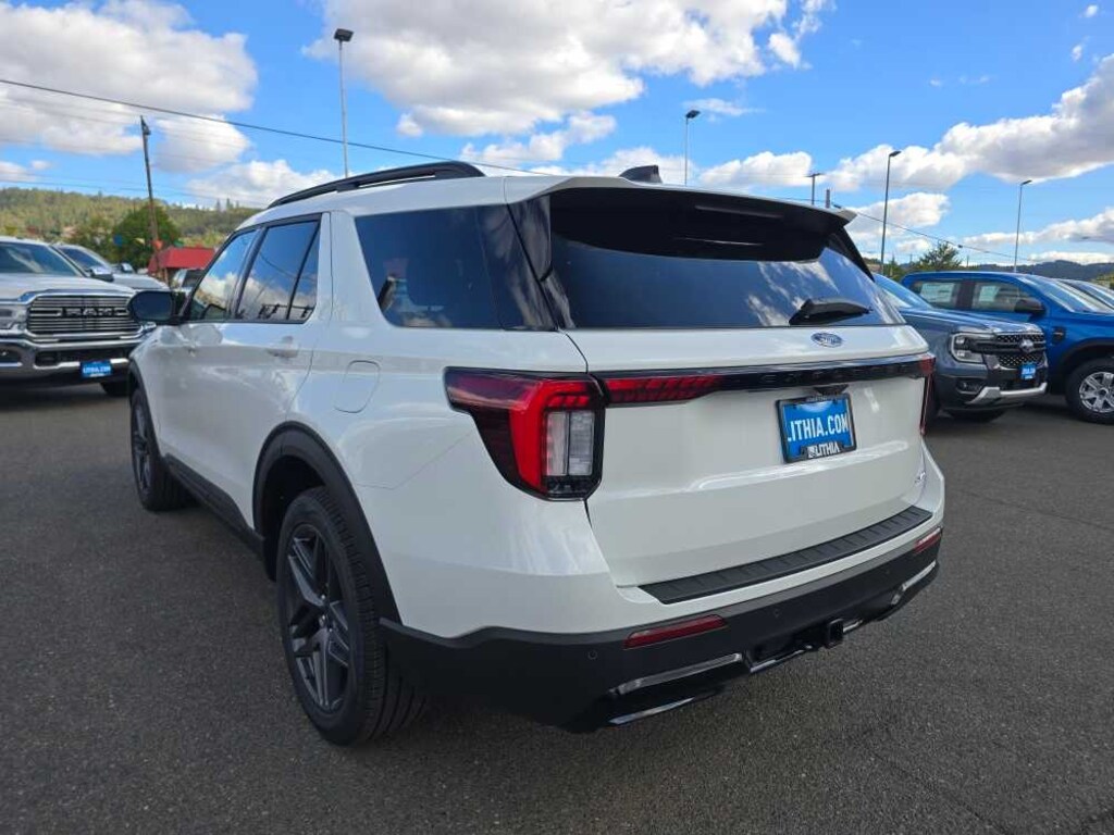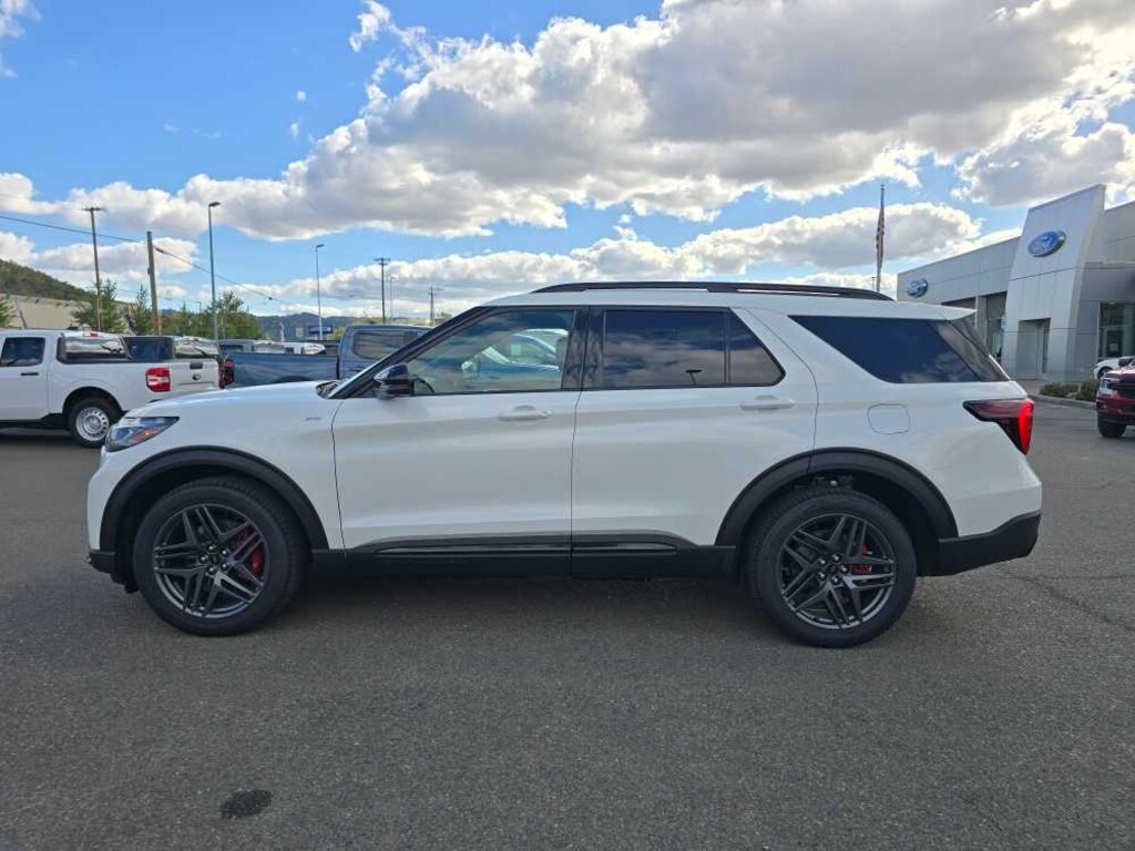 PANORAMIC VISTA ROOF W/POWER SHADE remote control front windows (opens front windows from outside of the vehicle via the key fob), PREMIUM PACKAGE 110V/150W AC Power Outlet, Replaces the powerpoint port on the rear side of the center floor console, Auto-Dimming Interior Rearview Mirror, Memory Drivers Seat, Power-Folding Sideview Mirrors w/Autofold, power and heated glass, LED turn signal indicators, security approach lamps, drivers side auto-dimming and driver and passenger side memory, Rain-Sensing Wipers (Front Only), Ambient Lighting, Wireless Charging Pad, 2nd Row Heated Seats, ST-LINE STREET PACK Wheels: 21 Magnetite-Painted Aluminum, Tires: P275/45R21 AS BSW, Performance Brakes, Red Painted Perf Front & Rear Brake Calipers, FORD BLUECRUISE EQUIPPED (1-YEAR PLAN) See ford.com/bluecruise for version details, Select option to purchase 1 year of BlueCruise access at time of vehicle order, After this initial duration, customers need to purchase a subscription to continue using BlueCruise, See subscription options and pricing on ford.com/bluecruise, Not available to military personnel sales (WAFAC), 18 SPARE WHEEL & JACK KIT 18 spare tire, FRONT & 2ND ROWS FLOOR LINERS W/CARPET FLOOR MATS front and 2nd rows black carpet floor mats, 2ND ROW CAPTAINS CHAIRS W/E-Z ENTRY & ARMREST E-Z entry is manually activated, Replaces standard 2nd row 35/30/35 bench seats, TRANSMISSION: 10-SPEED AUTOMATIC (STD). 2025 Ford Explorer with Star White Metallic Tri-Coat exterior and Onyx interior features a 4 Cylinder Engine with 300 HP at 5500 RPM*. Non-Smoker vehicle