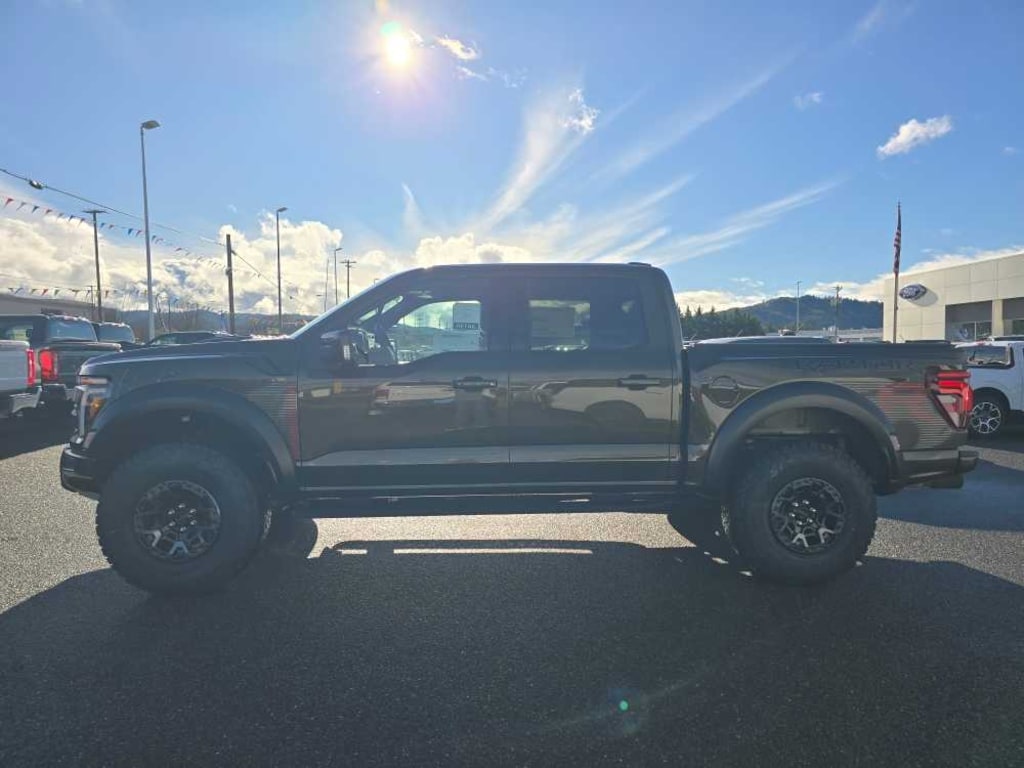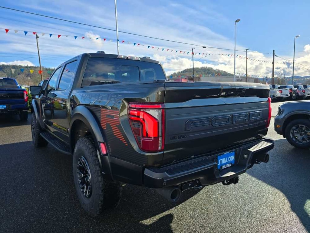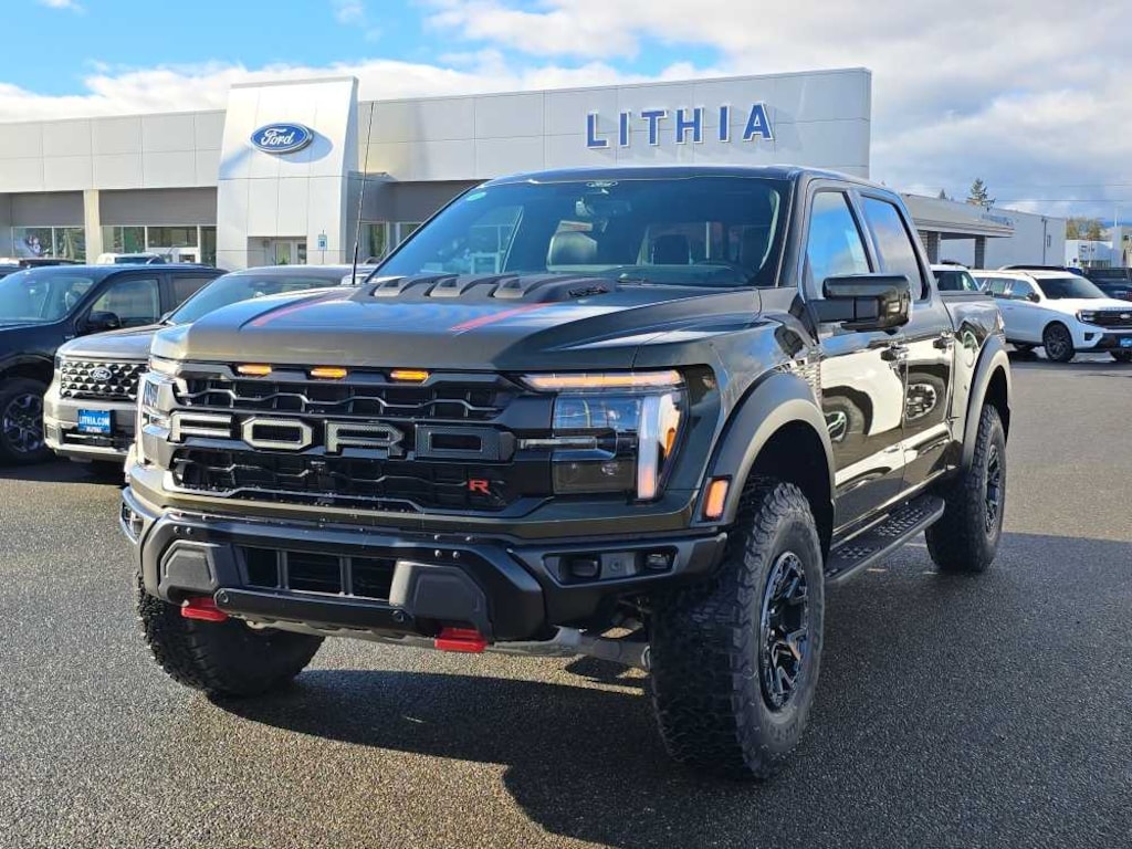Raptor R Exterior Graphics, GVWR: 7,500 lbs, Interior Code Orange Raptor R Badging, Raptor R Exterior Theme, Modular Front Bumper, Removes 2KW Pro Power Onboard, Engine: 5.2L Supercharged V8, Raptor R Unique Hood Vent w/R Badge, Raptor R Interior Theme, Unique Carbon Fiber Appliques, Raptor R Unique Grille, Dual Valve Shocks, Raptor R Badge Tailgate Applique, Code Orange Stitching Doors & Instrument Panel, Wheels: Raptor R Unique 17 Forged Aluminum, Bead lock capable, Tires: 37x12.5R17 BSW All-Terrain, Code Orange Front Tow Hooks, Upgraded Dual Exhaust, RETRACTABLE TONNEAU PICKUP BOX COVER, TWIN PANEL MOONROOF, TOUGH BED SPRAY-IN BEDLINER, SelectShift w/paddle shifters and terrain management modes: normal, sport, tow-haul, slippery, rock crawl, off-road and baja (STD). 2025 Ford F-150 with Shelter Green exterior and Black w/ Orange Stitching interior features a 8 Cylinder Engine with 450 HP at 5250 RPM*.