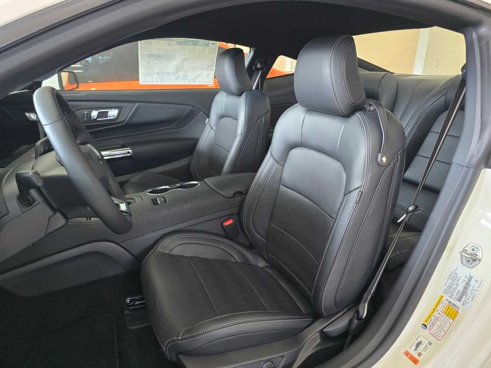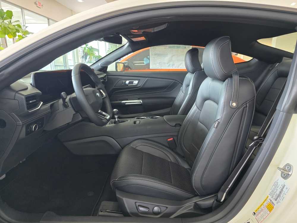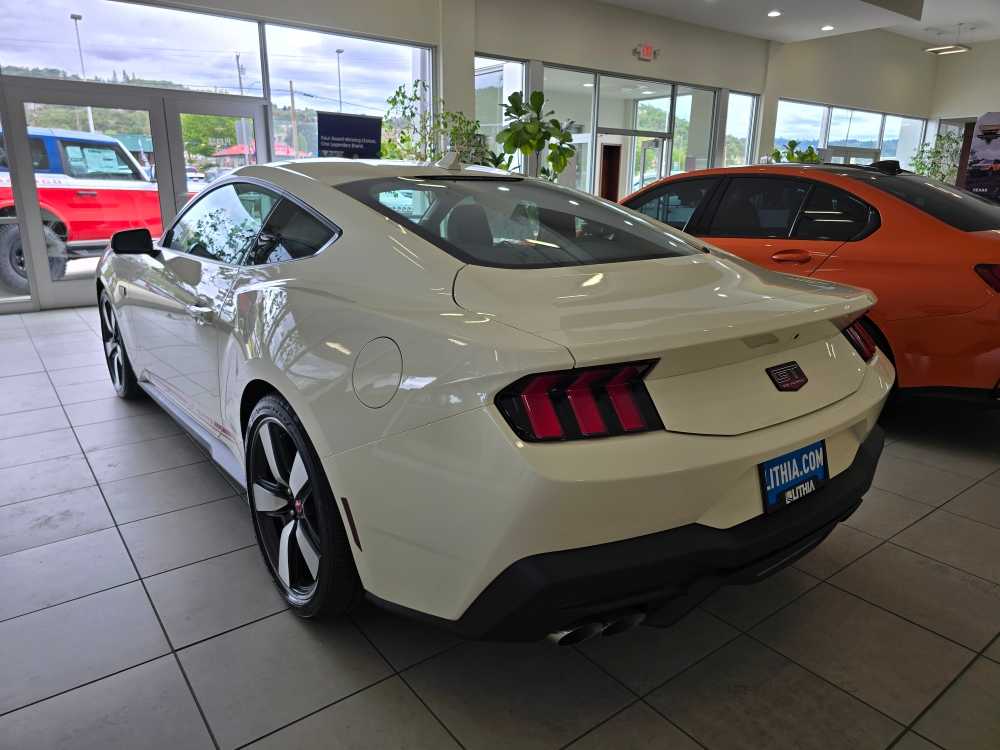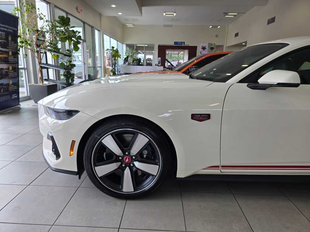 60TH ANNIVERSARY PACKAGE Mirror caps are painted body-color when Wimbledon White (N4) exterior paint is ordered, Anniversary Special Edition Badge, Wheels: 20 x 9 Bright Machined Aluminum, Tires: 20, Silver Painted Mirror Caps, Painted High Gloss Black Honeycomb Grille, Headlamps w/Black Bezels, Spoiler Delete, EQUIPMENT GROUP 401A HIGH PACKAGE Premier Trim w/Color Accent Group, accent stitched center console lid and shifter boot, 5-piece leather-wrapped steering wheel w/chrome bezel, unique color-accented door-trim and seat belt w/color accent stripes (black accent stripe/red background w/carmine red interior (53) or space gray accent stripe/black background w/black onyx and space gray interiors (5W/5H)), Instrument Panel w/Accent Stitch, Illuminated Door-Sill Scuff Plates, Security Package, Active Anti-Theft System, Locking Center Console, Wheel Locking Kit, 3.55 Limited Slip Rear Axle, Ford Co-Pilot360 Assist+, Pre-Collision Assist w/Automatic Emergency Braking, Evasive Steering Assist, Connected Navigation, Navigation services require SYNC4 and FordPass Connect (optional on select vehicles), BREMBO BRAKE SYSTEM W/PERFORMANCE LININGS, B&O SOUND SYSTEM BY BANG & OLUFSEN W/12 SPEAKERS subwoofer in trunk, ENGINE: 5.0L TI-VCT V8 stop/start system and Port Fueled Direct Injection (PFDI) (STD). 2025 Ford Mustang with Wimbledon White exterior and Black Onyx interior features a 8 Cylinder Engine with 480 HP at 7150 RPM*. Non-Smoker vehicle Superb Condition