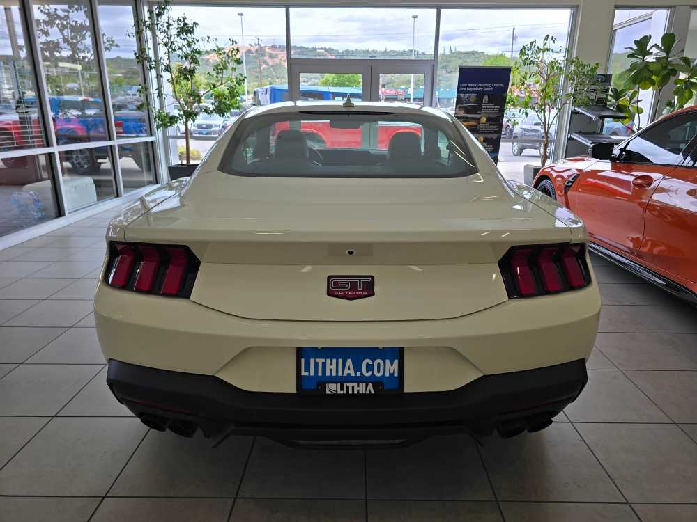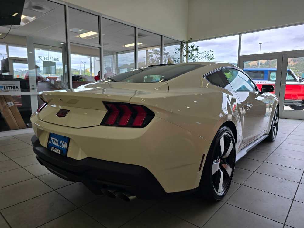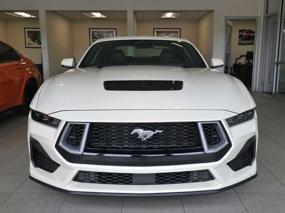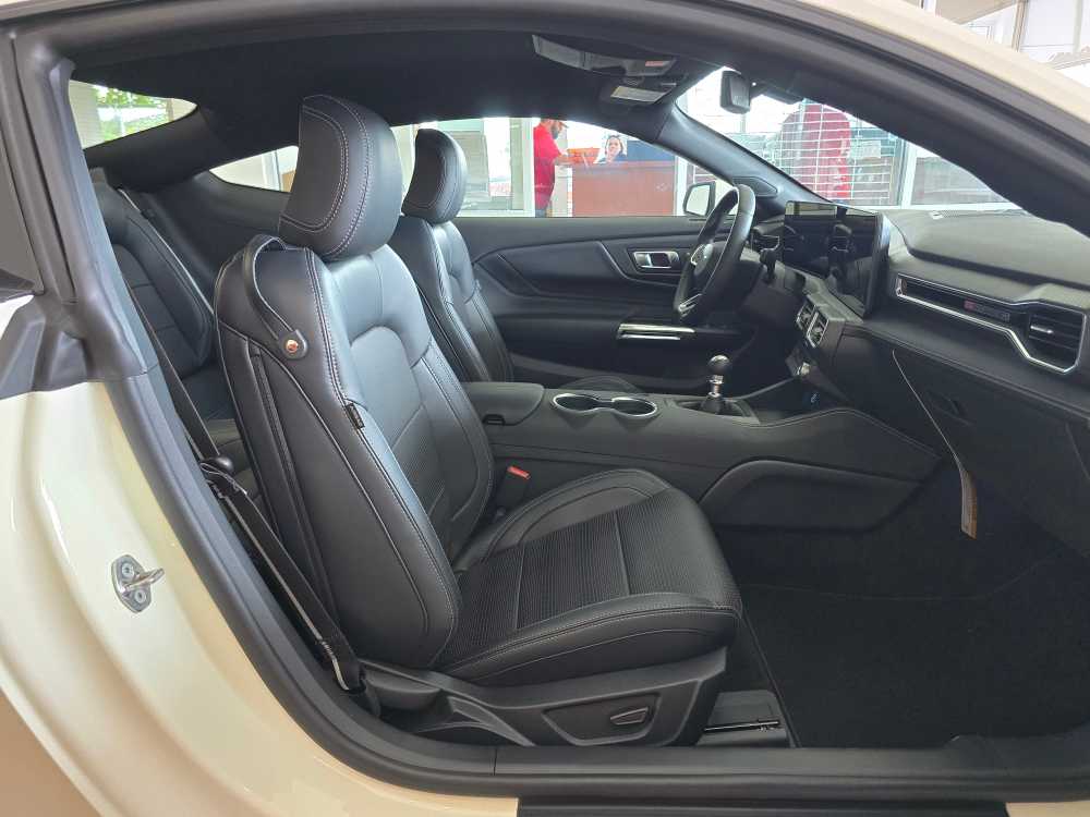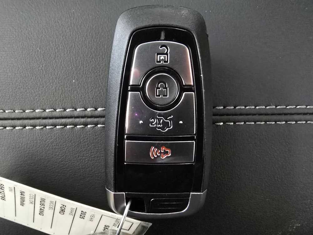60TH ANNIVERSARY PACKAGE Mirror caps are painted body-color when Wimbledon White (N4) exterior paint is ordered, Anniversary Special Edition Badge, Wheels: 20 x 9 Bright Machined Aluminum, Tires: 20, Silver Painted Mirror Caps, Painted High Gloss Black Honeycomb Grille, Headlamps w/Black Bezels, Spoiler Delete, EQUIPMENT GROUP 401A HIGH PACKAGE Premier Trim w/Color Accent Group, accent stitched center console lid and shifter boot, 5-piece leather-wrapped steering wheel w/chrome bezel, unique color-accented door-trim and seat belt w/color accent stripes (black accent stripe/red background w/carmine red interior (53) or space gray accent stripe/black background w/black onyx and space gray interiors (5W/5H)), Instrument Panel w/Accent Stitch, Illuminated Door-Sill Scuff Plates, Security Package, Active Anti-Theft System, Locking Center Console, Wheel Locking Kit, 3.55 Limited Slip Rear Axle, Ford Co-Pilot360 Assist+, Pre-Collision Assist w/Automatic Emergency Braking, Evasive Steering Assist, Connected Navigation, Navigation services require SYNC4 and FordPass Connect (optional on select vehicles), BREMBO BRAKE SYSTEM W/PERFORMANCE LININGS, B&O SOUND SYSTEM BY BANG & OLUFSEN W/12 SPEAKERS subwoofer in trunk, ENGINE: 5.0L TI-VCT V8 stop/start system and Port Fueled Direct Injection (PFDI) (STD). 2025 Ford Mustang with Wimbledon White exterior and Black Onyx interior features a 8 Cylinder Engine with 480 HP at 7150 RPM*. Non-Smoker vehicle Superb Condition