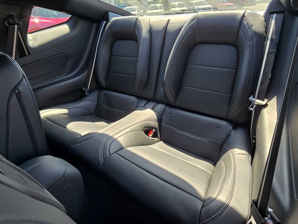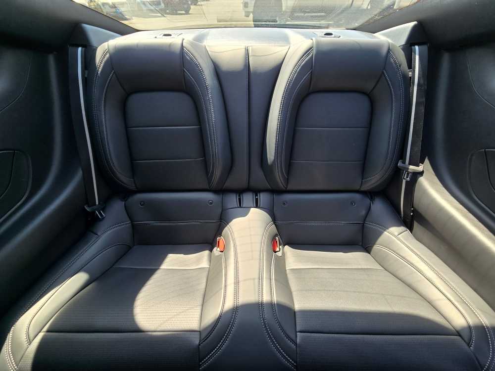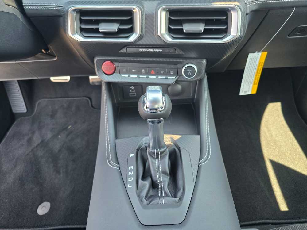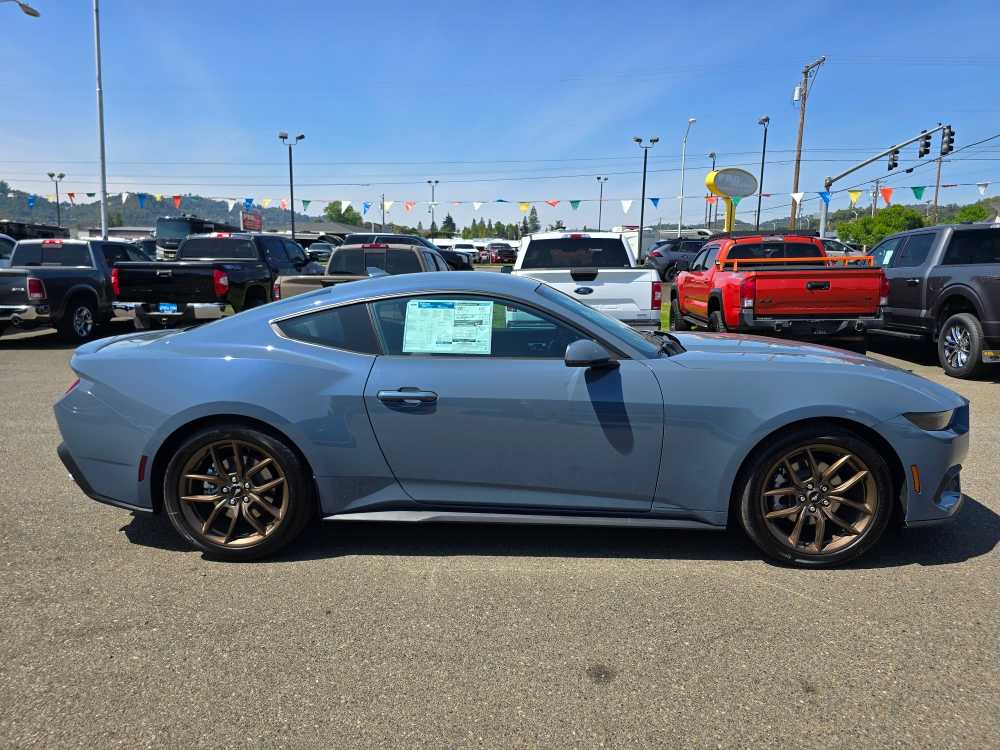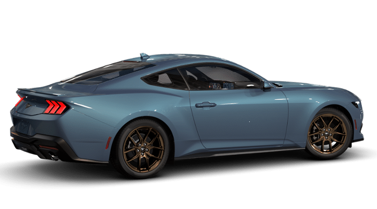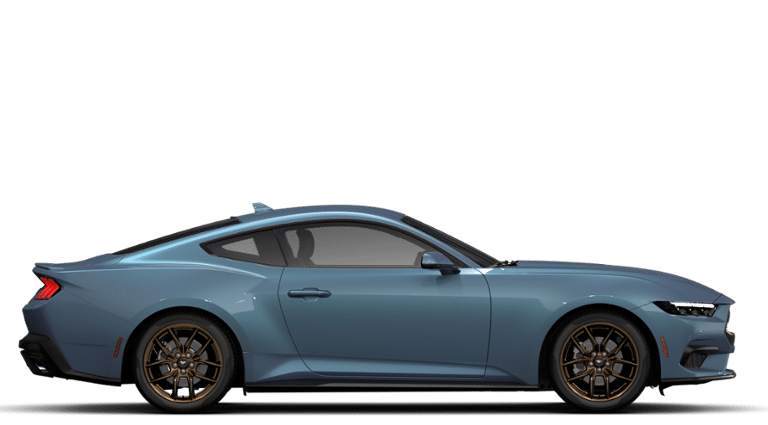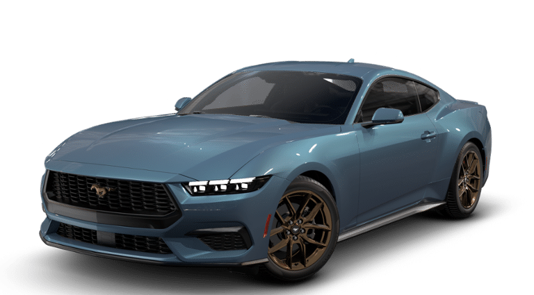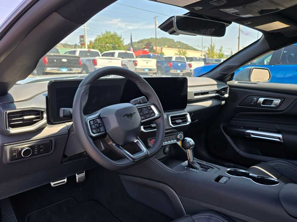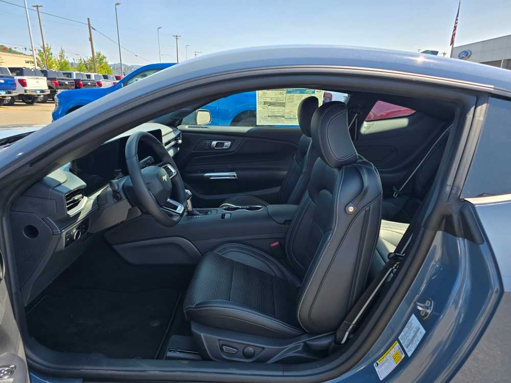 EQUIPMENT GROUP 201A HIGH PACKAGE Premier Trim w/Color Accent Group, accent stitched center console lid and shifter boot, 5-piece leather-wrapped steering wheel w/chrome bezel, unique color-accented door-trim and seat belt w/color accent stripes (black accent stripe/red background w/carmine red interior (53) or space gray accent stripe/black background w/black onyx and space gray interiors (5W/5H)), Instrument Panel w/Accent Stitch, Illuminated Door-Sill Scuff Plates, Security Package, Active Anti-Theft System, Locking Center Console, Wheel Locking Kit, Ford Co-Pilot360 Assist+, Adaptive Cruise Control w/Stop & Go, lane centering assist, intelligent speed assist and predictive speed assist, Pre-Collision Assist w/Automatic Emergency Braking, Evasive Steering Assist, Connected Navigation, BRONZE APPEARANCE PACKAGE Tires: 255/40R19W, Wheels: 19 x 8.5 Sinister Bronze Painted Alum, Sinister Bronze Front & Rear Pony Badges, MINI SPARE WHEEL & TIRE Replaces tire inflator and sealant kit, TRANSMISSION: 10-SPEED AUTOMATIC selectable drive modes (STD). 2025 Ford Mustang with Vapor Blue Metallic exterior and Black Onyx interior features a 4 Cylinder Engine with 315 HP at 5000 RPM*. Non-Smoker vehicle Superb Condition