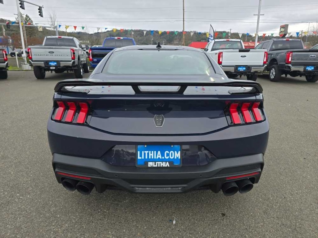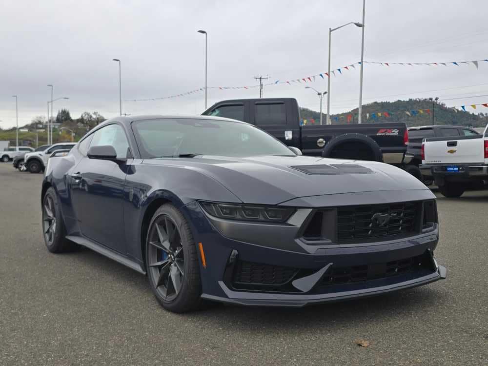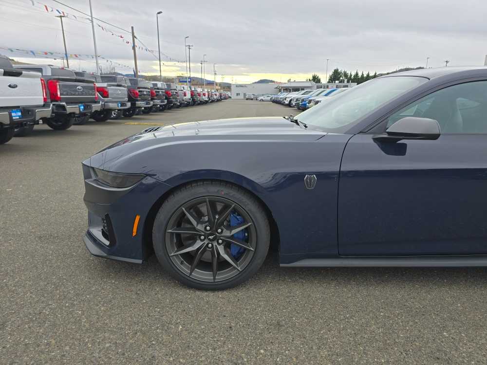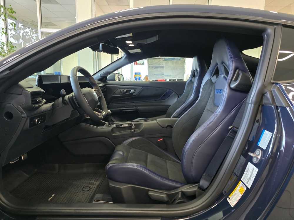 DARK HORSE HANDLING PACKAGE: adjustable strut top mounts (installed at plant) and revised chassis tuning, Magnetic Damping System, Performance Rear Spoiler w/Gurney Flap, Painted shadow black, Wheels: 19 x 10.5 Fr/19 x 11 Rr Tarnished Alum, Dark-painted, Tires: 305/30R19 Front & 315/30R19 Rear, Front Towing Hooks, Performance Front Aero Splitter, Placed in vehicle for installation post-sale, EQUIPMENT GROUP 700A DELUXE PACKAGE: Premier Trim w/Color Accent Group, accent stitched center console lid and shifter boot and unique color-accented door-trim, Security Package, Active Anti-Theft System, Locking Center Console, Wheel Locking Kit, Approach Detection, welcome/farewell exterior lighting, Universal Garage Door Opener (UGDO), Driver Seat & Mirrors Memory, 3 settings, Aluminum Foot Pedals, DARK HORSE APPEARANCE PACKAGE: additional blue seat accents, California special badge on strut tower brace and performance package front splitter, Notorious Blue Painted Brake Calipers, grabber blue logo, Painted Black Roof, Unique Hood Graphic, RECARO SPORT SEATS, WHEELS: 19 X 9.5 FR/19 X 10 RR SINISTER BRONZE: Painted aluminum, Tires: 255/40R19 Fr & 275/40R19 Rr Summer, BLUE EMBER METALLIC. 2025 Ford Mustang with Blue Ember Metallic exterior and Black w/Blue Accents interior features a 8 Cylinder Engine with 500 HP at 5000 RPM*. Non-Smoker vehicle Superb Condition