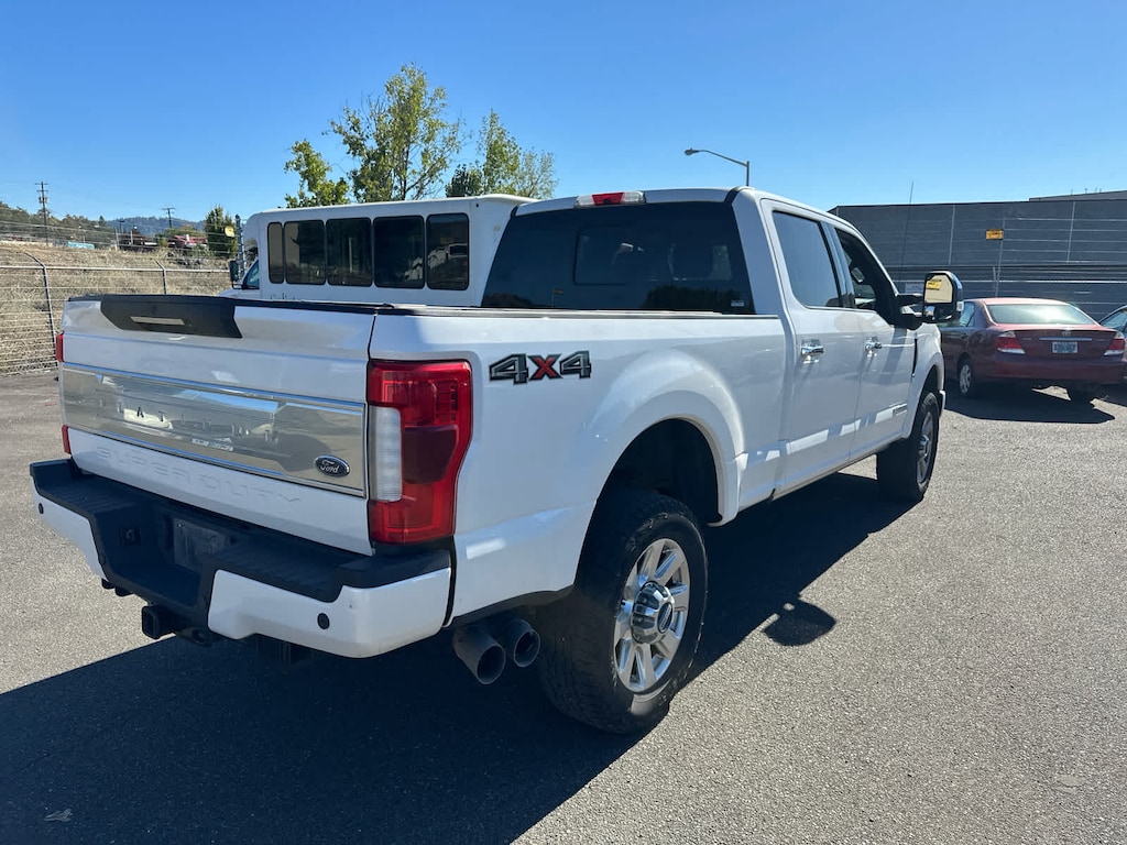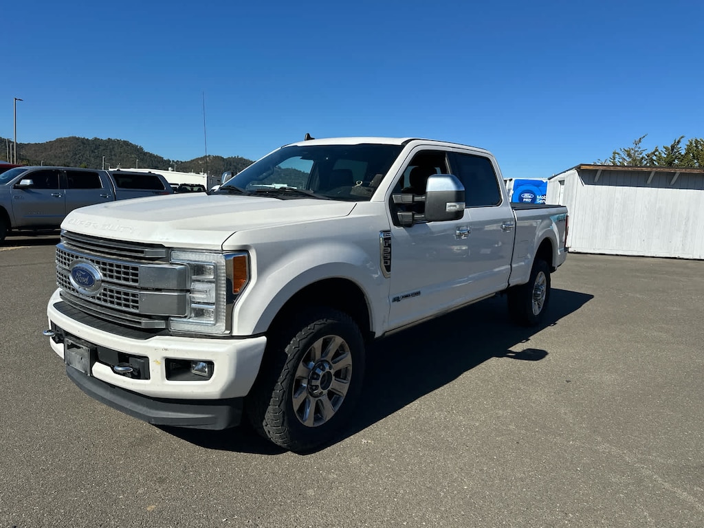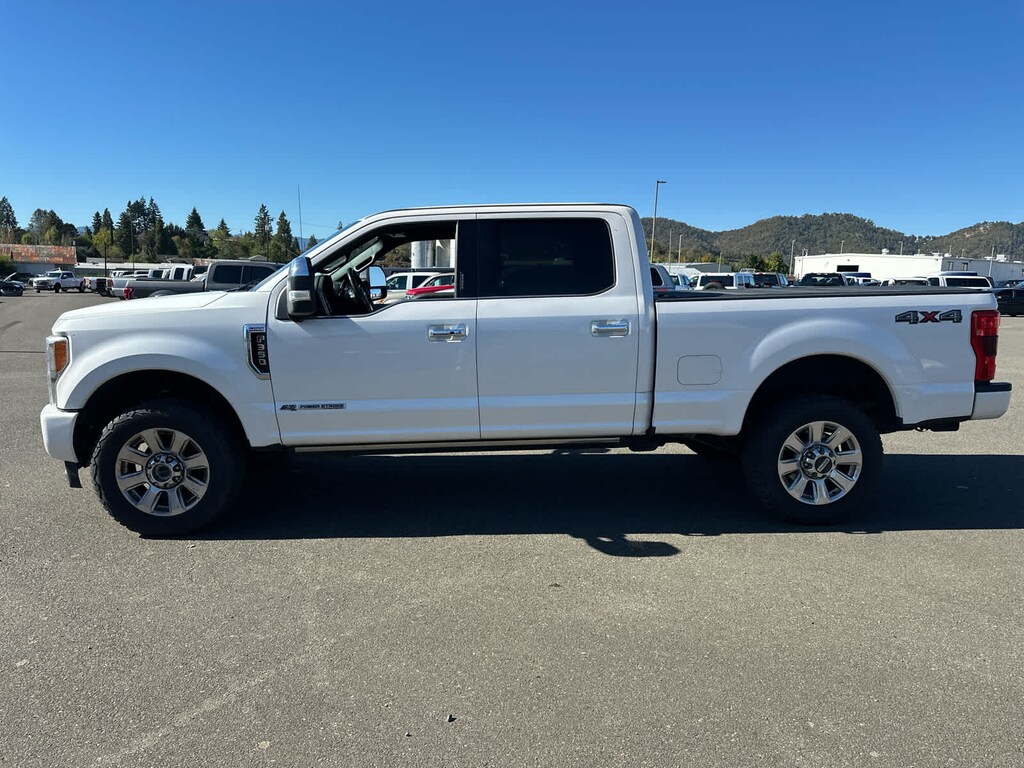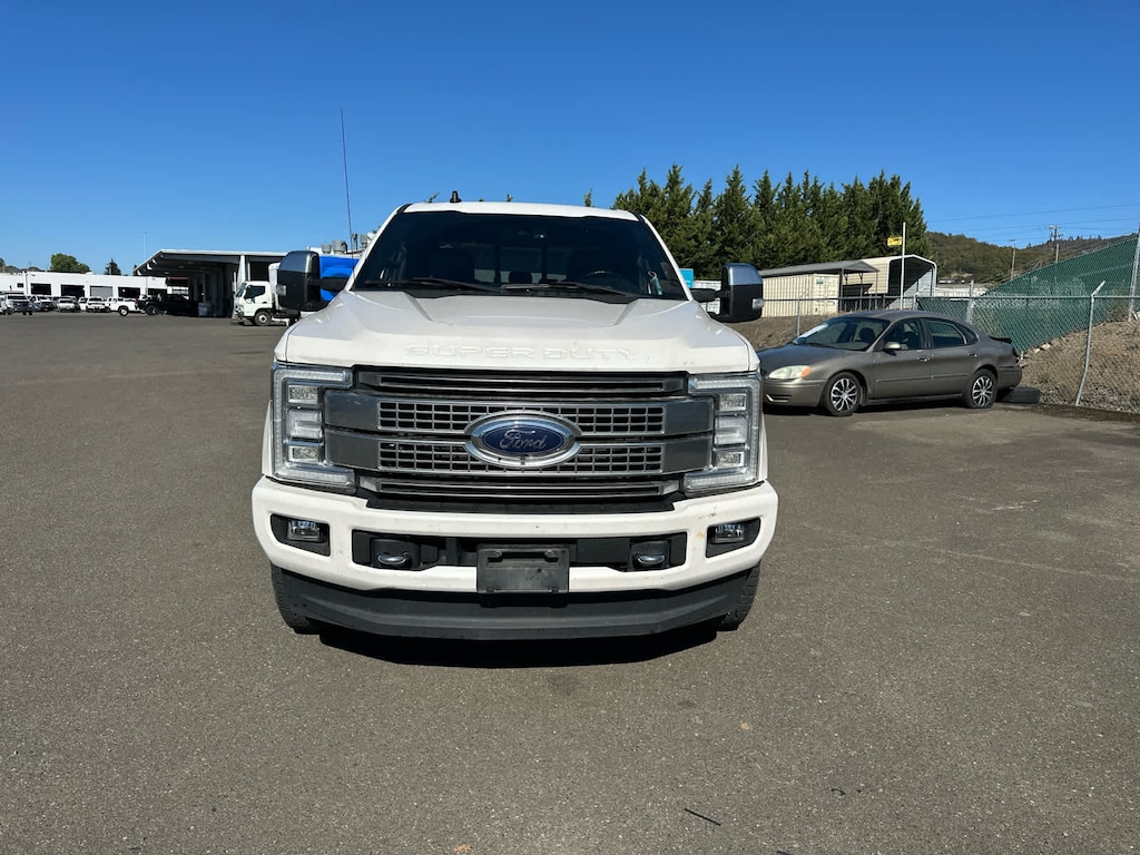 ENGINE: 6.7L 4V OHV POWER STROKE V8 TURBO DIESEL B20 manual push-button engine-exhaust braking and intelligent oil-life monitor, Extra Heavy-Duty 220 Amp Alternator, 3.55 Axle Ratio, 34 Gallon Fuel Tank, GVWR: 11,500 lb Payload Package, Dual 78-AH 750 CCA Batteries, PLATINUM ULTIMATE PACKAGE Adaptive Cruise Control & Collision Warning, brake support, Ultimate Trailer Tow Camera System, 360 degree camera system and trailer reverse guidance, Display appears in center-stack screen, NOTE: Does not include customer placed trailer camera, Rear CHMSL Camera, Display in center stack screen, LED Center High-Mounted Stop Lamp (CHMSL) w/cargo light and rear video camera, Lane-Keeping Alert, Twin Panel Power Moonroof, map lights and moonroof switches, TOUGH BED SPRAY-IN BEDLINER tailgate-guard, black box bed tie-down hooks and black bed attachment bolts, ELECTRONIC-LOCKING W/3.55 AXLE RATIO, TRANSMISSION: TORQSHIFT 6-SPEED AUTOMATIC (6R140), SelectShift. 2019 Ford Super Duty F-350 SRW Pickup with White Platinum Metallic Tri-Coat exterior and Black interior features a 8 Cylinder Engine with 450 HP at 2800 RPM*. Non-Smoker vehicle