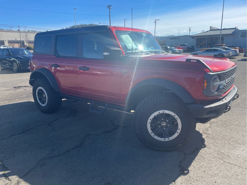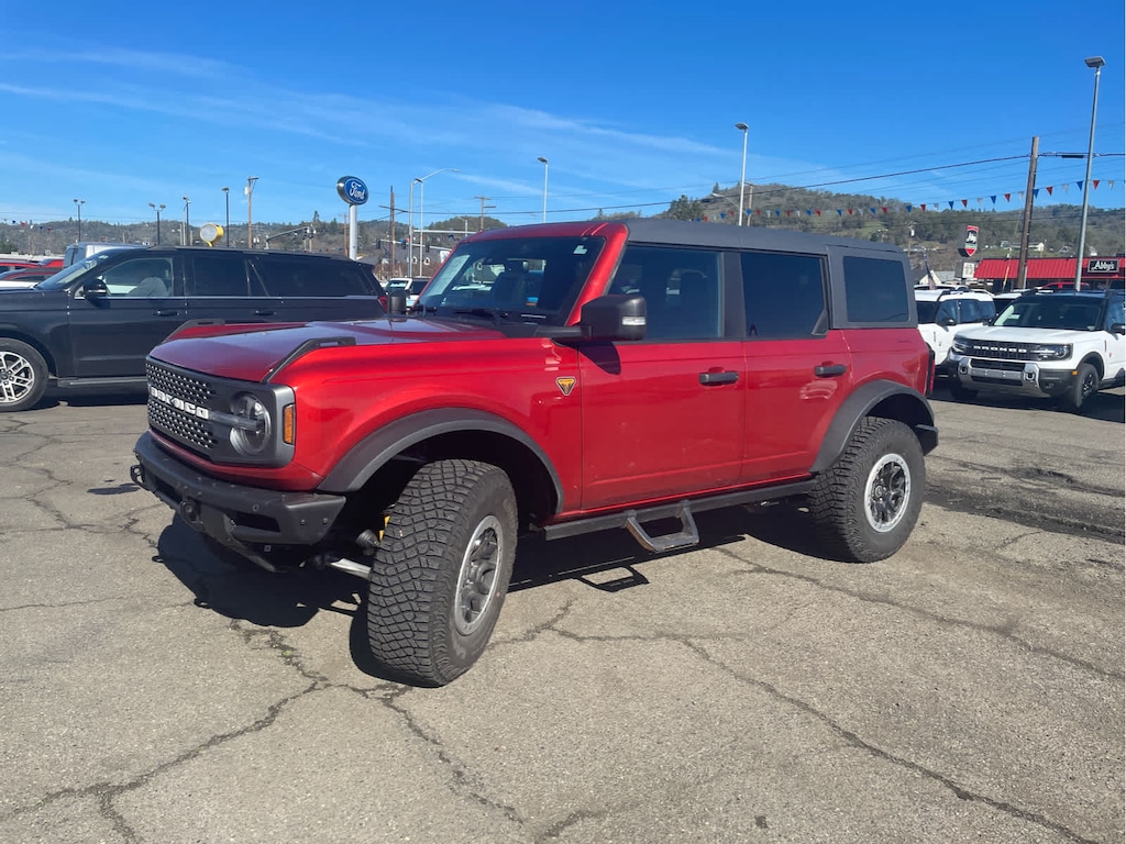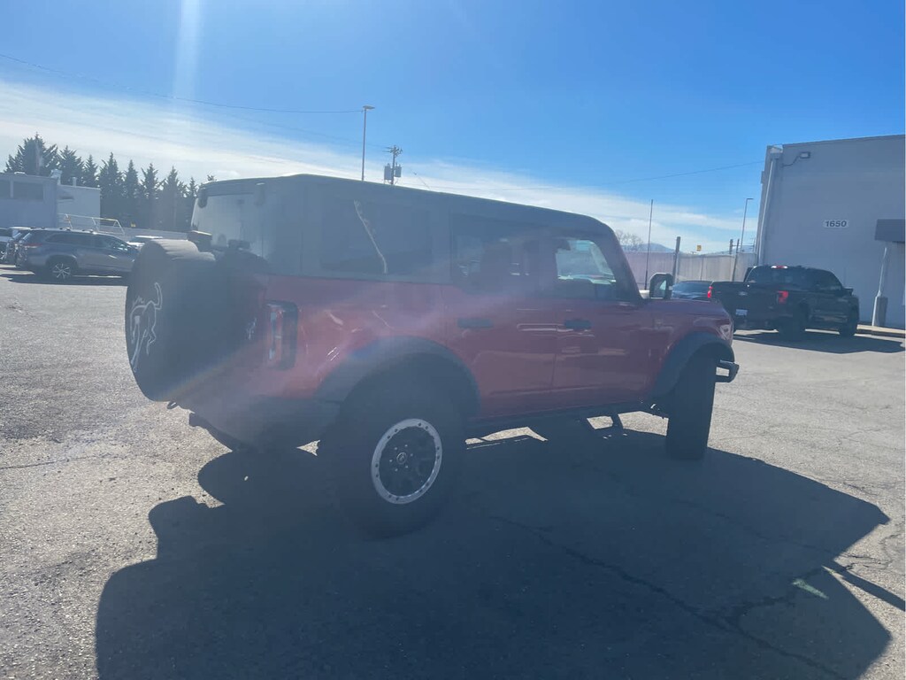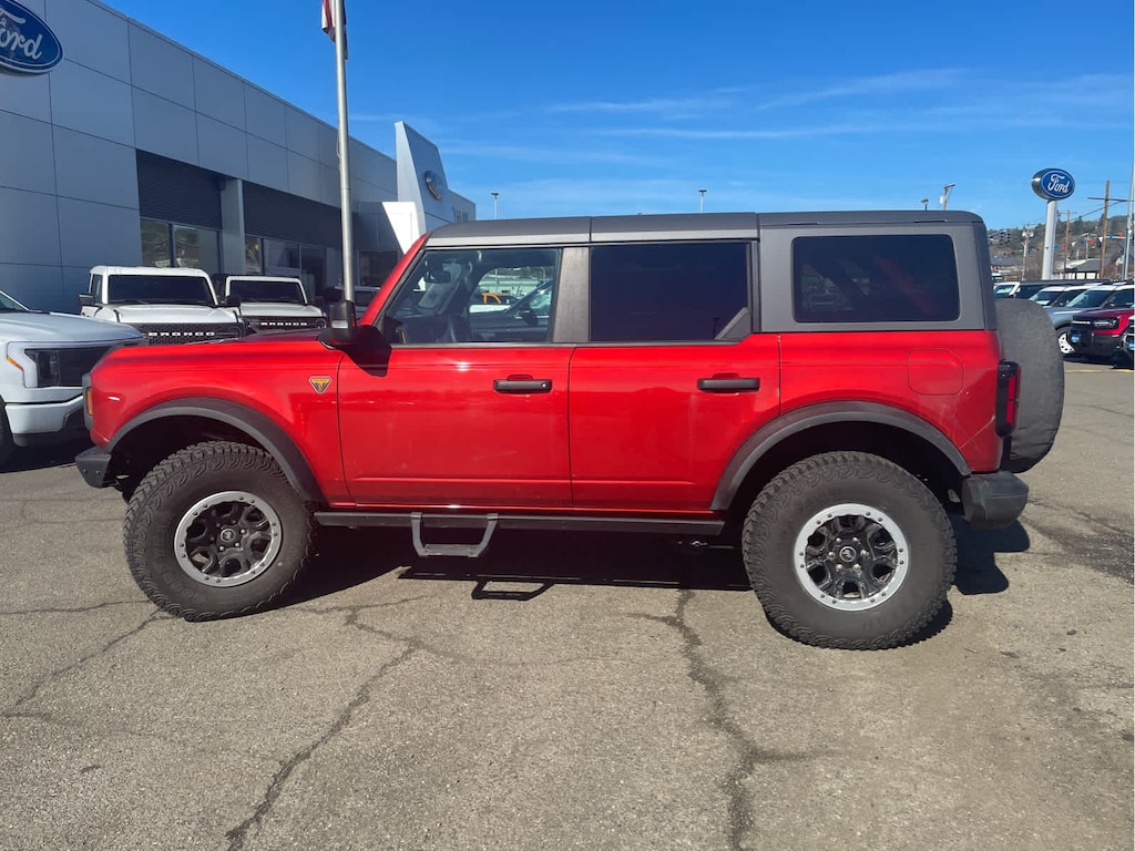 EQUIPMENT GROUP 334A HIGH/LUX PACKAGE Rear Parking Sensors, Power Outlet - Back Side of Center Floor Console, Auto-Dimming Interior Rearview Mirror, Dr & Pass Illuminated Sliding Visor Vanity Mirrors, Evasive Steering Assist, Heated Steering Wheel, Additional Sound Deadening, Information on Demand Panel, Wireless Charging Pad, Dual-Zone Electronic Automatic Temperature Control, air conditioning, Ford Co-Pilot360, Enables compatibility w/FordPass performance app w/off-road navigation, Auto High-Beam Headlamps, Pre-Collision Assist w/Automatic Emergency Braking, pedestrian detection, forward collision warning and dynamic brake support, Blind Spot Information System (BLIS), Cross-Traffic Alert, Rear View Camera, backup assist grid lines, Lane-Keeping System, Lane-Keeping Alert, Lane-Keeping, SASQUATCH PACKAGE Wheels: 17 Black High Gloss-Painted Aluminum, warm alloy beauty ring and beadlock capable wheels, High Clearance Fender Flares, High Clearance Suspension, 4.7 Final Drive Ratio, Tires: LT315/70R17 Mud-Terrain, Position-Sensitive Bilstein Shock Absorbers, CARBONIZED GRAY MOLDED-IN-COLOR HARD TOP Rear-Window Defroster & Washer, Hard Top Sound Deadening Headliner, Front Row Top Panels Storage Bag, For on-vehicle storage, ENGINE: 2.7L ECOBOOST V6 electric brake boost, GVWR: 6,180 lbs, TRANSMISSION: 10-SPEED AUTOMATIC trail control, trail turn assist and trail one-pedal driving, 4.46 Axle Ratio, FRONT & REAR FLOOR LINERS W/O CARPET FLOOR MATS Custom accessory, pre-installed, Deletes standard carpet front and rear floor mats. 2024 Ford Bronco with Hot Pepper Red Metallic Tinted Clearcoat exterior and Black Onyx interior features a V6 Cylinder Engine with 315 HP at 5500 RPM*.