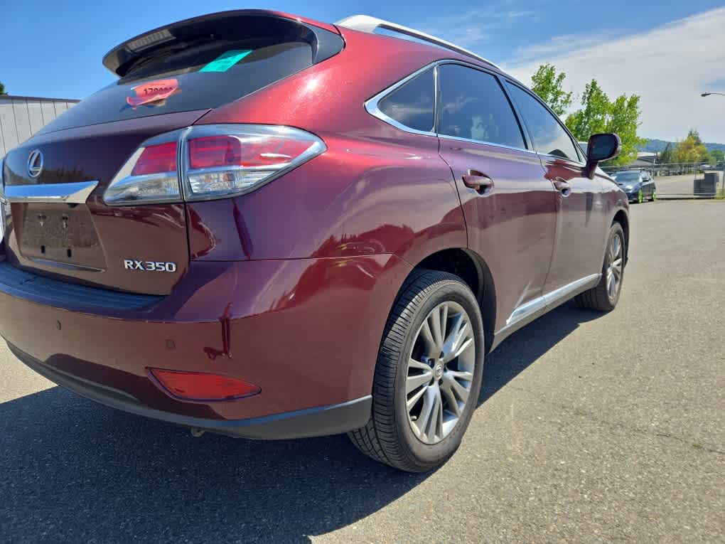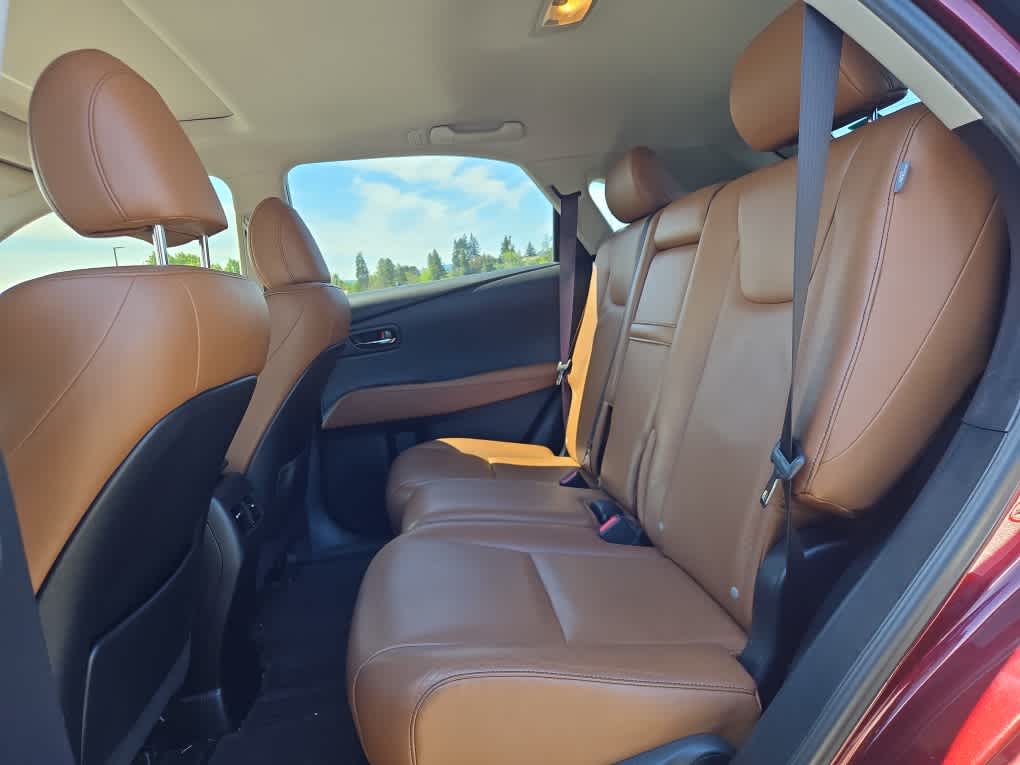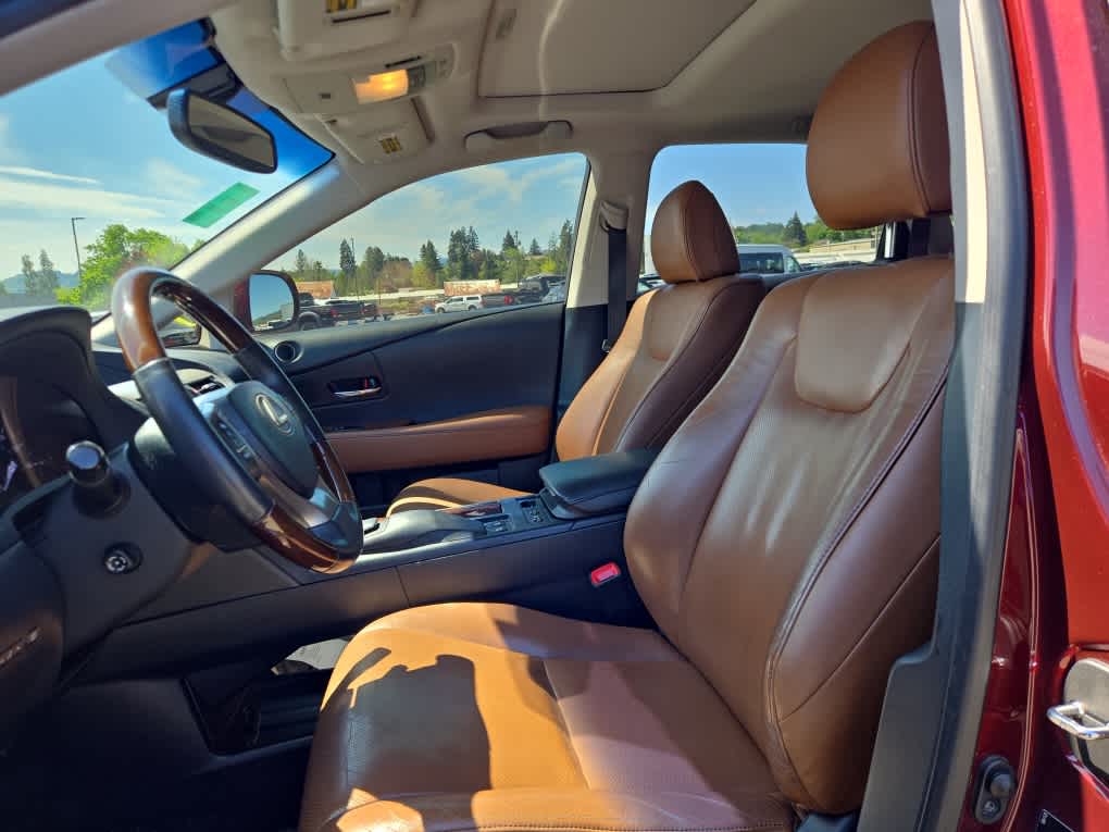 remote touch navigation controller, HDD Navigation System w/Advanced Voice Command, Generation 7, backup monitor and casual-language voice recognition system, Lexus Enform 2.0 w/Safety Connect, automatic collision notification, stolen vehicle location, emergency assist button (SOS), enhanced roadside assistance, destination assist, eDestination and enform application suite ( included), SiriusXM NavTraffic/NavWeather, sports, stocks and gas prices, HD Radio w/iTunes Tagging, Lexus Insider, Roof Rails, Driver Seat/Steering/Mirror Memory - 3 Settings, One-Touch Open/Close Moonroof, tilt-and-slide, Power-Folding Electrochromic Outside Mirrors, Rear Armrest Storage w/Lid, Blind Spot Monitoring Lane Change Assist, Heated & Ventilated Front Seats, Xenon High Intensity Discharge Headlamps, Projector headlamps, Rain-Sensing Wipers, Tires: P235/55VR19 AS, INTUITIVE PARKING ASSIST, WOOD & LEATHER-TRIMMED STEERING WHEEL & SHIFT KNOB. 2014 Lexus RX 350 with Claret Mica exterior and Saddle Tan interior features a V6 Cylinder Engine with 270 HP at 6200 RPM*. Non-Smoker vehicle